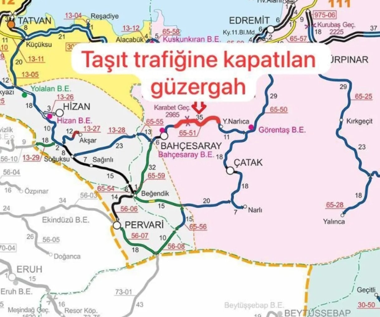 Bahçesaray güzergâhında etkisini artıran kar yağışı ve tipi nedeniyle görüş mesafesinin düşmesi üzerine Karayolları ekipleri tarafından geçişlere izin verilmedi. Bahçesaray Kaymakamlığı, sosyal medya hesaplarından yaptığı açıklamada, 65-51 Bahçesaray (Liman Mevki) – Çatak (Yukarı Narlıca Mahallesi) karayolu güzergâhının geçici olarak çift yönlü trafiğe kapatıldığını duyurdu.