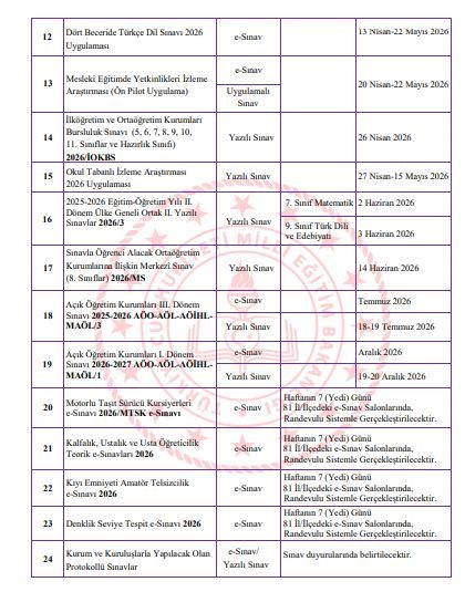 Ayrıca takvimde; gerçekleştirilecek Açık Öğretim Kurumları Sınavları, izleme araştırmaları ile e-Sınav merkezlerinde yapılacak sınavların tarihlerine de yer verildi.